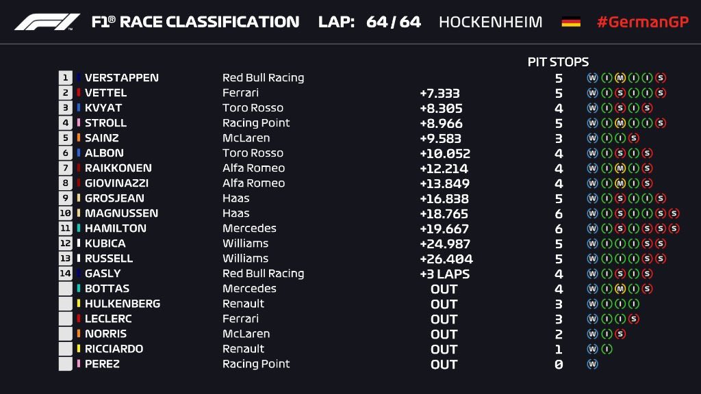 Órákkal a Német Nagydíj után módosult a verseny hivatalos végeredménye. Raikkönen és Giovinazzi idejéhez 30 másodpercet írtak hozzá, a Williams megszerezte idei első pontját.